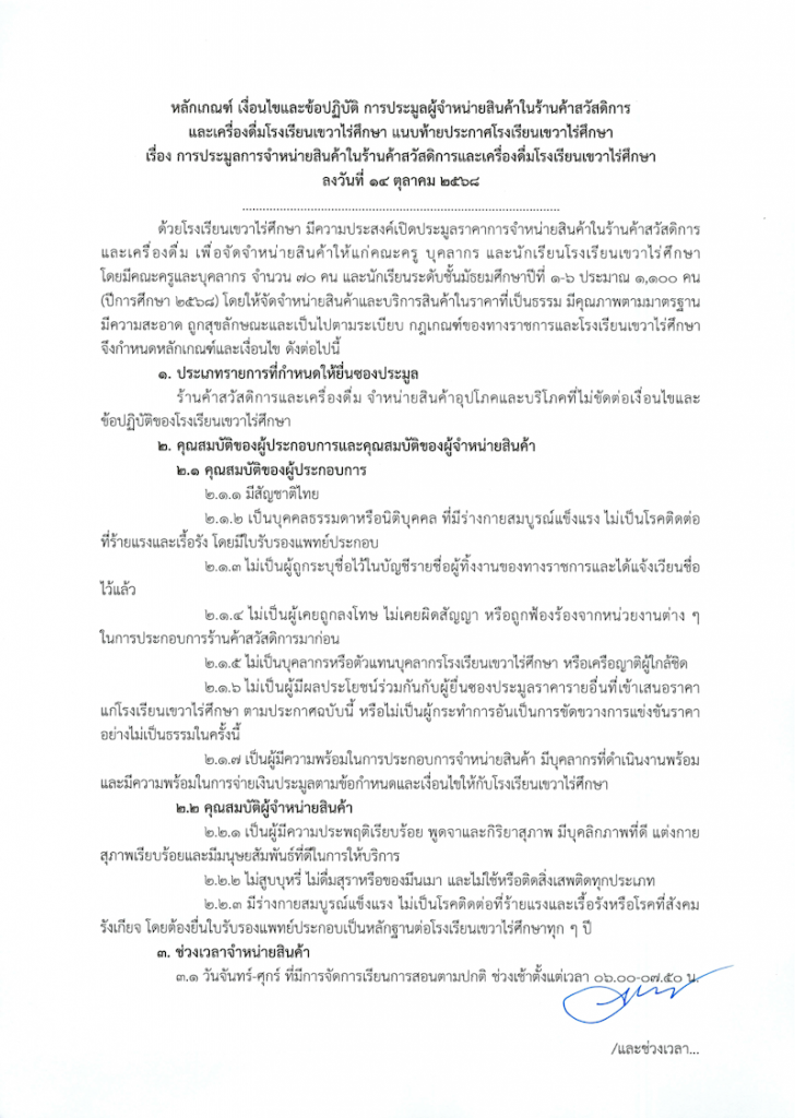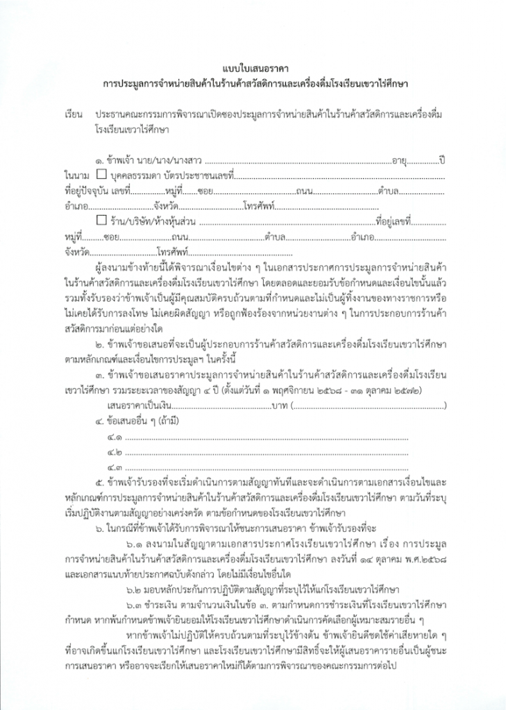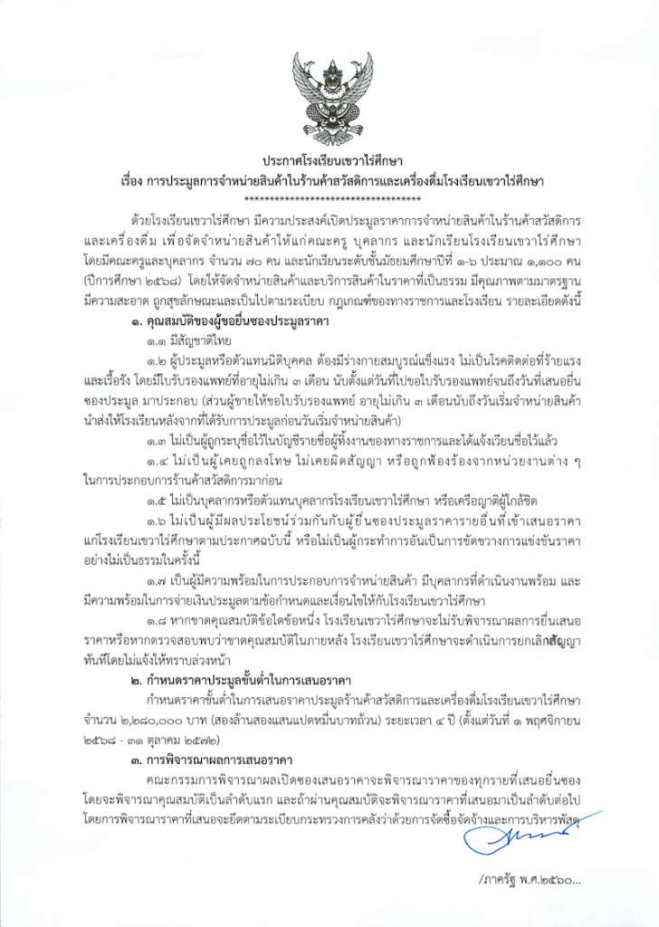 จัดซื้อจัดจ้าง ประกาศโรงเรียนเขวาไร่ศึกษา เรื่อง การประมูลการจำหน่ายสินค้าในร้านสวัสดิการและเครื่องดื่มโรงเรียนเขวาไร่ศึกษา 14/10/2025 admin ดาวน์โหลดไฟล์เอกสาร